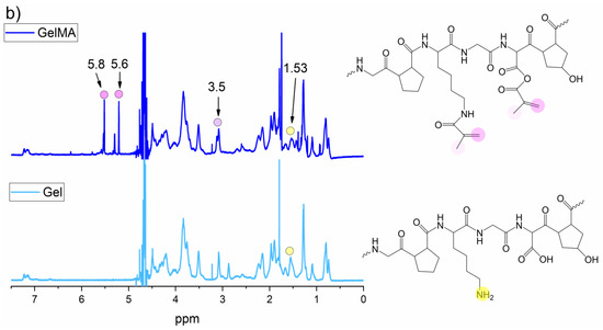 In Figure 3b the spectra of Gel before and after the methacrylation reaction are reported. Also in this case, the accomplishment of the methacrylation reaction was confirmed by the appearance of new bands in the GelMA spectrum at 1380 and 830 (1/cm) which can be assigned to the C−O stretching and C=C bending vibrations, respectively [56,57].