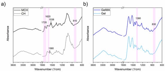 FTIR spectra of (a) CH and (b) Gel before and after the methacrylation reaction.