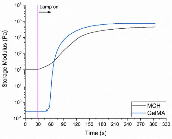 Photorheology curves recorded for the MCH formulation (3 wt% solubilized in acetic acid-water solution containing 2 phr of Irgacure 2959), GelMA formulation (10 wt% solubilized in distilled water containing 1 phr of Irgacure 2959).