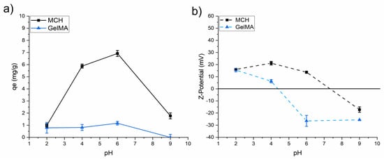 The adosorption capacity of Pb(II) was investigated following the same procedure previously reported for As(V) oxyanions. Figure 9 reports the Pb(II) adsorption of the MCH and GelMA hydrogels as a function of pH. At pH 6 the GelMA, with the net negative surface charge is the only material capable to interact with the positively charged metal cation. At basic pH it can be noticed that both MCH and GelMA possess a negative Z-potential and can therefore be applied to lead removal (see Figure 6b). As such, all of the Pb(II) adsorption tests were conducted only on MCH at pH = 9 and on GelMA at pH = 6.
