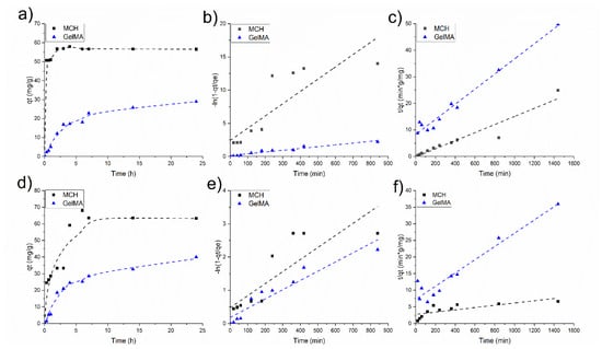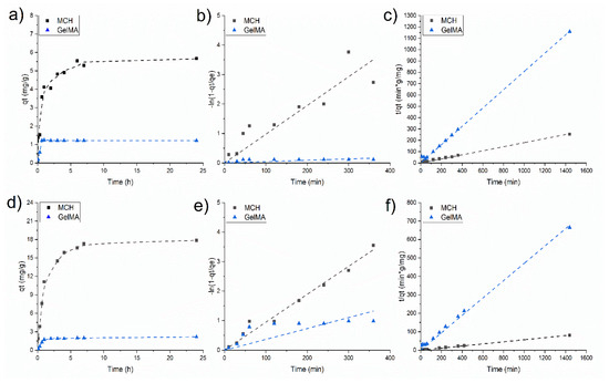 Figure 7 reports the adsorption kinetics profiles of As(V) obtained for two initial concentration (10 and 20 mg/L) at different time intervals at pH 6. The adsorption on the hydrogels is fast with GelMA as it reaches a plateau after 1 h, while in the case of MCH 8h are required (see Figure 7a,d). In both cases, the adsorption rates are higher in the initial part of the experiments suggesting that the adsorption mainly occurs on the surface of the hydrogels. The MCH sorption equilibrium time is slightly shorter than the one previously reported in the literature for other chitosan-based systems such as chitosan beads (24 h) [38] and modified chitosan gel beads (24 h) [63].