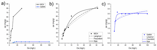 Figure 11a shows the isotherm values obtained for MCH and GelMA hydrogels, where it can be seen that both solids are able to adsorb significant amounts of Pb(II), achieving values of ca 66 and 48 mg/g, respectively. It is important to underline that the achieved maximum values of Pb(II) adsorption capacities are similar to those previously obtained with other adsorbents. For comparison purpose, Table 5 summarizes the list of other Pb(II) absorbents available in the literature. Figure 11b, reports the R(%) of MCH and GelMA at the different initial Pb(II) concentrations. Interestingly, those percentages were very high, achieving almost 99% for low initial concentration and (>80%), also with high content of metal, so highlighting the great removal capability toward Pb(II) of these biobased hydrogels.