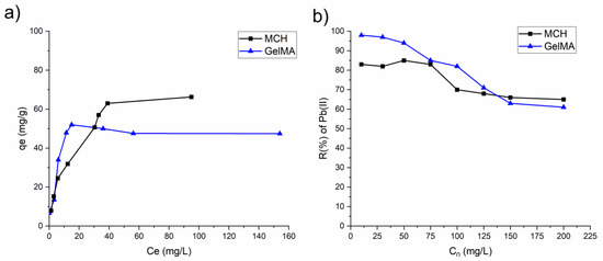 (a) Isotherm plots of MCH and GelMA hydrogels obtained from the experimental data; (b) removal percentage R(%) of Pb(II) by MCH and GelMA at different initial concentration.