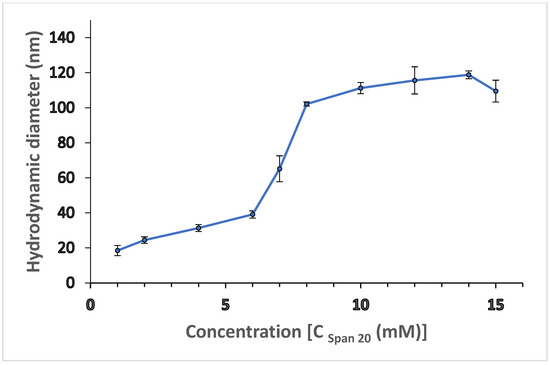 Apparent hydrodynamic diameter of aggregates formed by SPAN 20 in hexane, measured by DLS. Error bars are standard deviations.