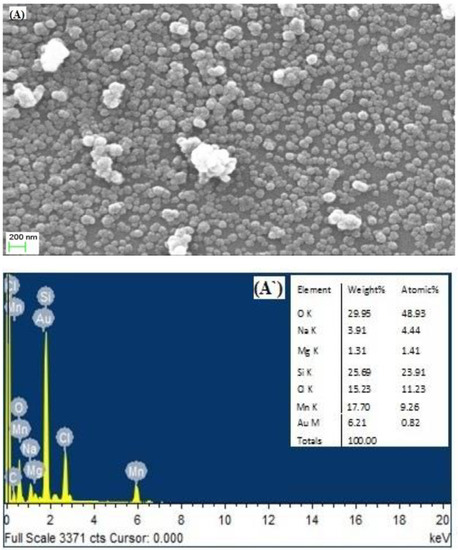 SEM (A–C) and EDX (A’–C’) micrograph of Mn–alginate, Fe–alginate, Co–alginate nanogels.