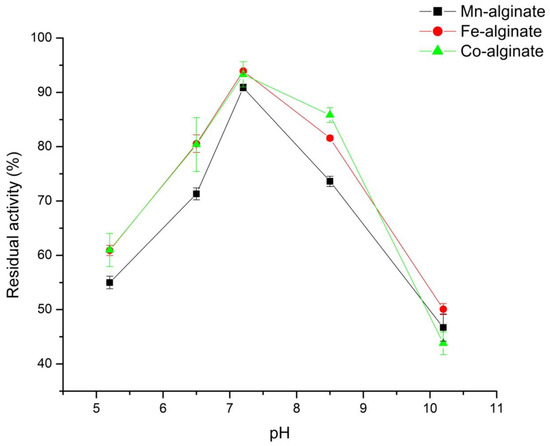 Enzyme loading efficiency is simply the ratio of bound protein inside the alginate nanogel structure and the total protein used in the pre-gel mixture. In cases of nanogels cross-linked with 3d metallic ions (Mn2+, Fe3+, and Co2+), the percent immobilization values are similar to, or lower than, the enzyme loading efficiency data (Table 4), suggesting the partitioned microenvironment of alginate nanogel structure had no effect. But the mass transfer limitations and steric hindrances could be relevant and pronounced in these nanogel structures, which affects the enzyme activity by retarding the rate of the biochemical reaction. Similar effects have been reported in many enzyme-immobilized matrices [108,109,110,111], which supports our finding.