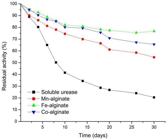 All forms of urease were stored at 4 °C in 100 mM Tris-acetate-saline buffers at pH 7.2. The stabilities of the different urease preparations were determined by measuring the specific enzyme activity of immobilized urease and soluble urease in Tris-acetate-saline buffer at 25 ± 1 °C, using the urease assay method over a period of four weeks. The percent (%) of residual activity, versus the number of days, is shown in Figure 6. Enzyme activity retention depends on the nature of the carrier and the nature of the enzyme [116]. The zeta potential of alginate nanogels, reported in Table 3, has negative value and these suggest the open porous structure of different nanogels. The pH value of urease is 5.97, as reported in the literature [117]. Thus, at pH 7.2, the carboxylic function of the alginate gel structure shows repulsion towards the negatively charged urease. With time, these carboxylic functional group present on alginate matrix may change the microenvironment of porous nanogels, leading to the loss of enzymes [111]. The encapsulated urease enzyme in Fe–alginate nanogels showed maximum stability (90% activity), up to 6 days. The zeta potential value, which is a measure of stability of nanogels in water, is also largest for the Fe–alginate nanogels. Thus, colloidal stability helps in the retention of enzyme activity in Fe–alginate nanogels.