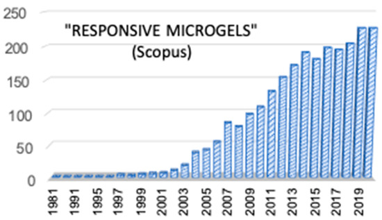 In 1949 Baker et al. coined for the first time the word microgels referring to cross-linked polybutadiene latex particles [1]. However, microgels already existed before, since the beginning of the industrial polymer synthesis in the 1920s, and were recognized as undesired subproducts derived from the synthesis of elastomers. Microgels are defined as intra-molecularly cross-linked polymer particles in a colloidal size range. This definition is widely accepted and brings implicitly the following: (1) the small particle size range of 10–1000 nm, which is typical of colloidal particles, and (2) they are dispersed in a solvent [2,3,4,5,6]. Additionally, microgels are in an intermediate step between branched polymers and macroscopic networks, which implies that in a suitable solvent they swell instead of dissolving, thus forming a colloidal dispersion, as mentioned. They are also considered as soft particles with the ability to rapidly respond to variations in their environment, resulting in changes in their polymer chain conformation. Furthermore, depending on the building monomer, on the composition, and on the added chemical functionalities, microgels can be sensitive to external stimuli such as temperature, pH, and ionic strength, among others, thus revealing their versatility and potential applications further described in this review. In order to highlight the relevance of microgels within polymer science, in Figure 1 the evolution of the citations about responsive microgels up to 2020 is shown.