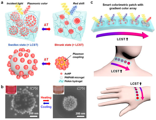 (a) Schematic illustration of the plasmonic microgels in the PAAm hydrogel under swollen and shrunken states. (b) SEM images of the plasmonic microgels with 51-nm AuNPs under the swollen state at 24 °C (left) and under the shrunken state at 50 °C (right); the inset images show pictures of the plasmonic microgel dispersions under each condition. (c) Schemes of the sensor array patches attached to human skin at different positions (neck and hand). (Reprinted from Ayoung Choe et al. [47]; licensed under Creative Commons CC BY li (open access)).