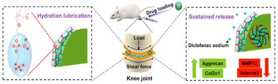 In the last decades, colloidal microgels have gained notoriety in the development of biological lubricants. Biolubricants’ main function is to hamper the joints from suffering friction during movements. When this biolubrication fails it can cause important damage in the cartilage and, in the worst scenario, this could end up in a replacement of the joint. The lubricity is mainly originated from the contribution of two different constituents, which are cartilage and synovial fluid [65]. From the point of view of material science, the cartilage can be considered as a hydrogel due to its elasticity and softness. In this regard, researchers have performed a large number of studies on hydrogel tribology in seeking materials with an ultra-low coefficient of friction and high load [66,67,68]. However, it is well established that mechanical properties of hydrogels offering good lubricant property are poor, thus limiting their practical applications. Considering this problem, microgels represented an advance in the field due to the exhibited advantages based on (1) their colloidal stability, which ensures smooth water lubrication, (2) their viscoelasticity, which provides better compression (friction) resistance, and (3) the possibility of loading drugs, providing an additional therapeutic function [49]. An example of the potential that microgel systems might have as biological lubricants can be found in the recent work of Han et al. with the development of injectable microgels that demonstrated improved lubrication and controlled drug release for the treatment of osteoarthritis [69] (see Figure 3). Before this, Liu et al. synthesized magnetite-loaded thermoresponsive PNIPAM-based microgels able to reduce friction when used as an additive in aqueous lubricants. The relevance of this research is centered on the ability to remotely control, by temperature, magnetic field, and light, the colloidal properties and, therefore, the friction occurring in the interface [70].
