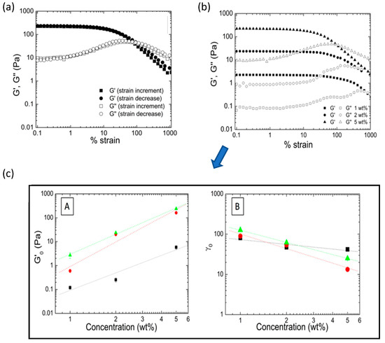 (a) Evolution of elastic (G′) and viscous (G″) modulus as a function of % of strain determined as the strain increases and decreases. (b) Strain sweep test corresponding to microgel aqueous dispersion (1, 2, and 5 wt%) containing 10% of AuNP. (c) Double-logarithmic plots of the elastic modulus plateau G′ (A) and critical strain γc (B) as a function of microgel concentration. Adapted from Echeverria et al. [115]; licensed under CC BY 4.0 (open access).