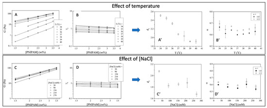 Graphs on the left: double-logarithmic plots of the elastic modulus G′ (A,C) and critical strain γc (B,D) of the hydrogels gelled at various temperatures and various [NaCl], as a function of microgel concentration. Graphs in the right: (A’,C’) fractal dimension, df, and (B’,D’)) the parameter, α, of the in situ-formed gels gelled at various temperatures calculated using the Wu and Morbidelli model. Adapted with permission from [118], copyright 2012 American Chemical Society.