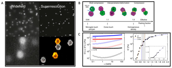 Many the of studies described in the review assumed microgels as spherical gel particles, and theories that are applied for polymer gels have been used to describe or predict elastic properties [3,103,121]. Nowadays, after years of research, the microgel particles are described as having a polymer gel core with a gradient of cross-linking, which decreases toward the outer side of the particle, and with dangling ends in contact with the solvent [129]. This particular morphology or microstructure is responsible for the ability to deform/compress microgels when interacting above a certain volume fraction (concentration). However, despite all the models, experimental work, and studies carried out on the rheological properties of microgels [130,131,132,133,134], there is still the need to build a widely accepted outline that could cover the entire range of packing densities, from glassy to jamming (or paste) up to highly compressed states (or overpacked states), and the interactions occurring among particles within each packing state. In order to go deeper in this aspect, and helped by the latest advanced characterization techniques, recent research has been focused on the study of microgel interactions at a single-particle nanoscale level based on zero average contact small-angle neutron scattering [135] and super-resolution microscopy [136,137,138]. A recent example of this can be found in the relevant work of Conley et al., where they studied the viscoelastic properties of a swollen, thermoresponsive PNIPAM-based microgel suspension having a dense core and a fuzzy shell, combined with the observation and analysis of the individual particle structure and morphology through super-resolution microscopy [139]. The objective of the research was to connect the mechanism beyond the viscoelastic properties of a microgel suspension, with the interactions occurring within microgels in the different concentration regimes (glassy, jamming, and compressed regimes). The structure and morphology of PNIPAM microgels and a pair of microgels were observed by means of super-resolution microscopy (Figure 6A) detecting three consecutive stages of packing, from jammed to overpacked (see Figure 6B) [137]. In the first stage, the shell of the microgel started to be compressed. However, as soon as the cores of the microgels made contact, microgel shell inter-penetration occurred and the microgels started to deform. This allowed a denser packing of microgels. Such inter-penetration/deformation continued and increased as the contact surface expanded. In the last stage, the remaining interaction mechanism within the microgel pair is the compression, resulting in the reduction in size of the swollen microgel. To connect these results with viscoelastic properties, frequency sweep tests were performed at different volume fractions (from jamming to overpacked). As shown in Figure 6C (left graph), all suspensions described an elastic modulus G′ almost independent of the frequency and being greater than G″, which is indicative of a solid-like behavior. To better understand the effect of volume fraction, the authors collected the G′ values at a constant frequency and represented as a function of the volume fraction (Figure 6C, right graph). Two differentiated behaviors marked by the shaded area were observed. Below the shaded area, which is the jamming packing fraction, the measured elastic modulus is weak, and it was associated with an entropic glass regime. Beyond this area, the elasticity was driven by the jamming elasticity, showing an increase in G′ of almost 3 orders of magnitude. However, as the volume fraction increased toward the overpacked state, the trend tended to stabilize and the slope reduced substantially. Definitively, among the major conclusions drawn from this research is that the particulate nature of microgel suspensions dominates the behavior also at their highest packing fractions. Additionally, microgels shared some properties with emulsions but entered into different regimes due to the deformation/compression ability up to the overpacked regime.