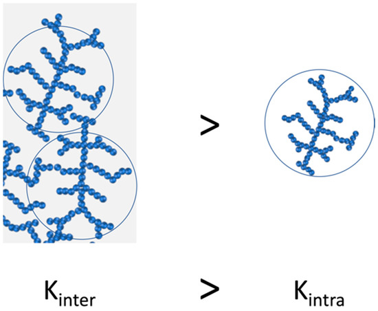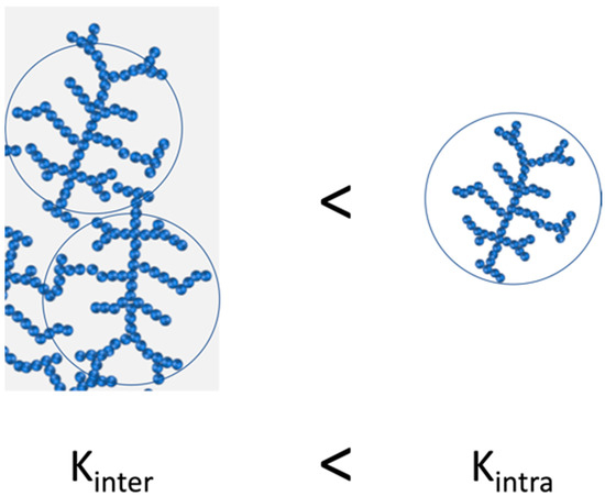 A colloidal system can be dispersed or flocculated depending on the energy of the interactions between particles and also the concentration [93,94]. The formation of clusters or agglomerates is a complex and random process that can result in self similarities or recurrence [95]. By means of computer simulation and subsequent experimental results, we can define the existence of two different growing mechanisms for the formation of clusters/agglomerates: diffusion-limited aggregation mechanisms (DLCA) and reaction-limited aggregation mechanism (RCLA) [96,97,98]. In the case of DLCA, the cluster aggregation is fast, deriving in a looser and ramified aggregated structure. In the case of RCLA, the aggregation regime is slow, resulting in aggregates with denser and compact structures. In addition, it has been theoretically determined that each growing mechanism is described by a specific fractal dimension value, approximately 1.7–1.8 and 2.0–2.2 for DLCA and RCLA, respectively; however, there is a large majority of systems that present intermediate aggregate formation mechanism [99,100,101,102].