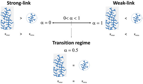 If Ka >> Kξ, then α = 0 and the macroscopic spring constant K would correspond to the strong-link regime determined by Shih et al. In contrast, when Ka << Kξ, then α = 1, which would correspond to a weak-link regime. Intermediate regimes are obtained for α values within a range of 0 < α < 1 (Scheme 4).