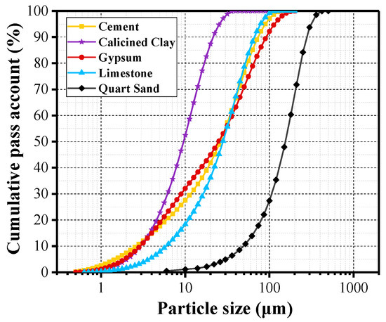 Figure 1. Calcined clay was made from kaolin tailings in Maoming, China. Calcined clay mainly contained quartz, illite, and amorphous phases. The chemical composition of all used binders in