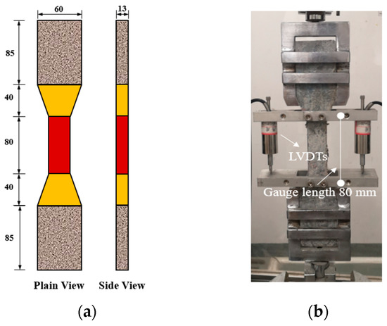 Figure 2a. An MTS Landmark electro-hydraulic servo machine was employed to carry out the uniaxial tensile test. The load was applied at the rate of 1 mm/min. The tensile deformation over the gauge length of 80 mm was measured by two linear variable displacement transducers (LVDTs) installed on the two lateral faces of the specimen, as shown in