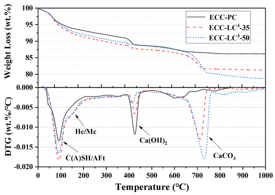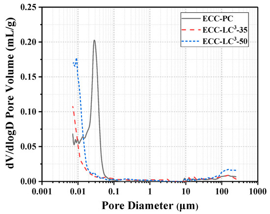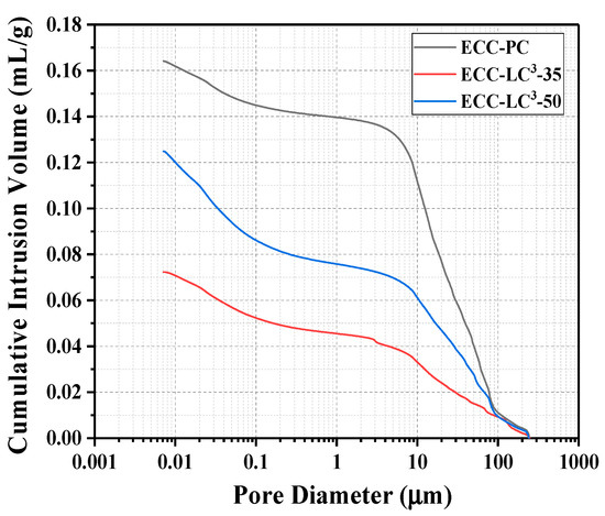 To characterize the influence of LC3 binder system on the micropore structure of ECC matrix, MIP was used to determine the porosity and pore size distribution curves of the matrix. Poromaster GT-60 Mercury Intrusion Porosimeter, Quantachromre (Boynton Beach, FL, USA), was used for MIP testing. The small sample particles were immersed in absolute ethyl alcohol to terminate hydration and then vacuum oven-dried at 60 ℃ for 24 h before test. The hydration phases of the cementitious matrix were investigated by carrying out XRD test. D8 ADVANCE X-Ray Diffractometer, BRUKER, AXS (Karlsruhe, Germany), was used for XRD testing. Samples were vacuum dried and then grounded into fine powders. Cu Kα radiation (λ = 1.54 Å) was performed at 40 kV and 40 mA, and the scan speed was set to be 0.02°/step. The TGA test was also conducted to study the phase assemblage of ECC matrix. STA409PC Simultaneous Thermal Analyzer, Netzsch (Nedgex GmbH, Selb, Germany), was used for TGA testing. The dried sample particles were heated from the range of 30 ℃ to 1000 ℃under a nitrogen atmosphere at a rate of 10 ℃/min. The weight loss was analyzed afterward.