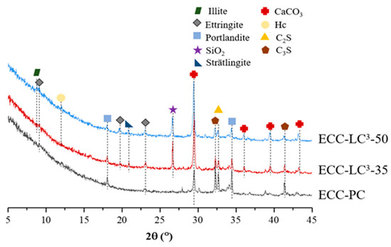 (3) The addition of LC3 leads to the pore refinement of the ECC matrix, especially for the ECC-LC3–35 group, which exhibits the highest strength at 28 days. The composition analysis indicates that carboaluminates are generated owing to the reaction between aluminates and calcium carbonate from limestone. Additional hydration products including C-(A)-S-H and Aft are also formed, which contributes to the densification of the microstructure of the ECC matrix. Besides, the Ca(OH)2 content is dramatically reduced while the CaCO3 content is remarkably increased.