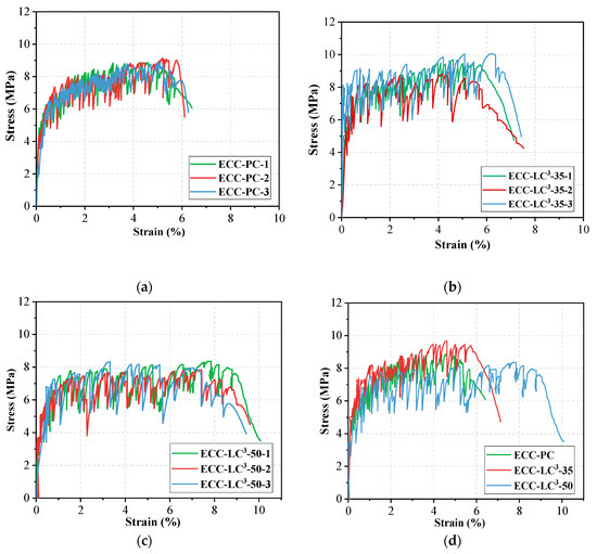 (2) The strain capacity of ECC is largely enhanced with the incorporation of LC. The increment ratio rises with the increase of LC3 dosage, with the strain capacity of ECC-LC3–50 being 57.96% higher than that of the OPC-based ECC. The improvement of strain hardening behavior is closely related to the higher fiber dispersion uniformity of LC3-based groups. For ECC-LC3–50, the relatively low initial cracking stress further favors the growth of cracks in a controlled manner.