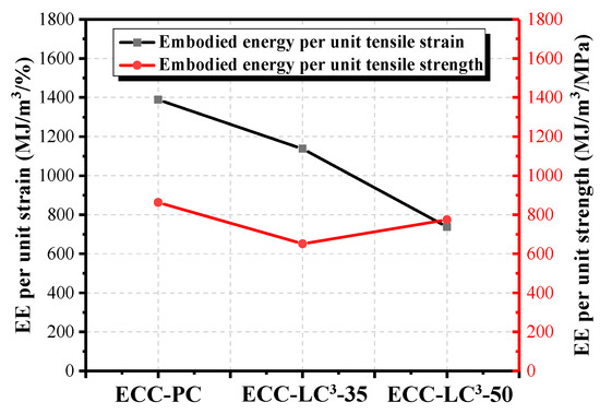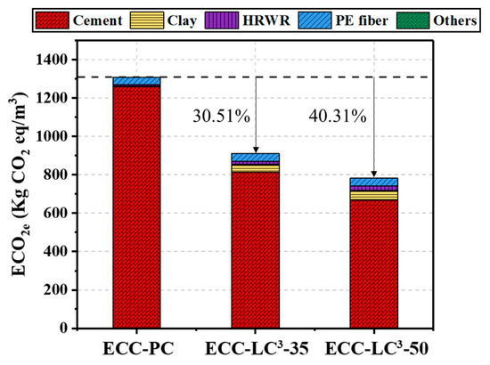 (4) The results of the life cycle assessment imply that the environmental impact of cement among all the components of ECC is the highest. When OPC is partly replaced by LC3, the consumed energy and equivalent CO2 emission decrease, especially the equivalent CO2 emission with the reduction ratio attaining 40.31%. Besides, the environmental impact of PE fiber and HRDR is non-negligible. By calculating the energy consumption and the equivalent CO2 emission per unit strain and unit strength, it is found that ECC-LC3–35 exhibits the highest mechanical resistance, and ECC-LC3–50 shows the best deformability from the environmental point of view.