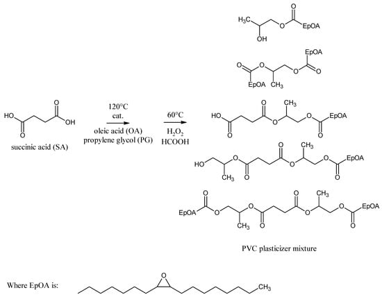The aim of this work was to compose environmentally friendly raw materials and synthesis conditions to directly obtain as the esterification product a mixture of esters that would be an effective combination of PVC plasticizers. In this way, it will be possible to produce an effective plasticizer mixture in an one-pot production process while reducing production costs and energy consumption. In this study, we synthesized epoxidized mixed esters based on succinic acid, propylene glycol, and oleic acid, which can be used as environmentally friendly PVC non-migrating plasticizers. The use of a mixture of different ester structures as plasticizers can have a beneficial effect on their performance properties, especially when these esters differ significantly in hydrocarbon chain length. The chemical structure of the main components of the obtained plasticizer mixture is shown in Figure 1.