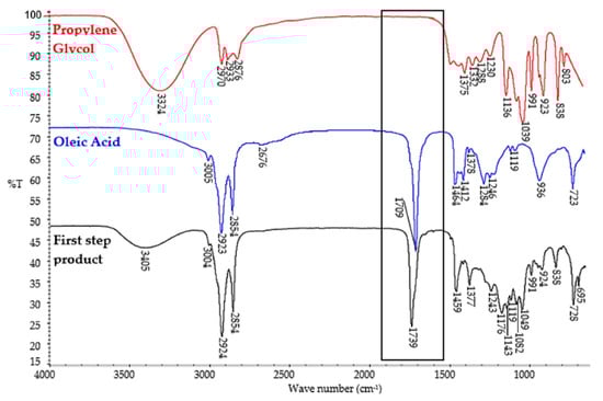 FT–IR spectra of raw materials (propylene glycol and oleic acid) and the first-step product.