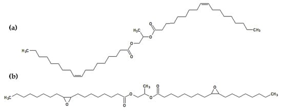 The chemical structure of (a) propylene glycol dioleate and (b) epoxidized propylene glycol dioleate.