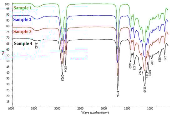 The structures of the obtained esters (Samples 1–4) were confirmed by FT–IR spectroscopy (Figure 4).