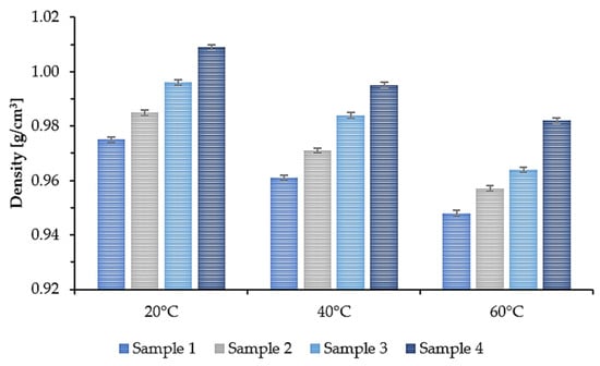 Density of epoxidized mixed esters (Samples 1–4) at 20, 40, and 60 °C.