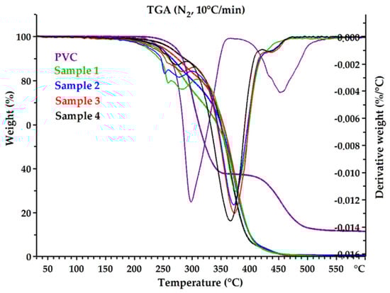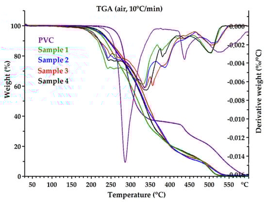 Plasticizers are often low-molecular-weight compounds with lower thermal stability than PVC (e.g., DEHP) [], which was also observed in this study. The temperature of 5% weight loss in the air for Sample 4 was 227.8 °C, while for pure PVC it was 264.9 °C, while in nitrogen it was 261.1 °C and 270.5 °C, respectively; the difference was not significant. The decomposition temperatures for the plasticizers themselves were significantly higher than the processing temperature of PVC, so they can be successfully used to produce flexible PVC.