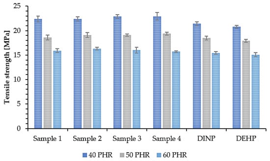 On a macroscopic scale, all soft PVC samples were homogeneous, and the prepared samples were slightly yellowish in color changing to darker shades up to orange at a lower plasticizer content. According to the results shown in Table 7, all soft PVC samples had a similar density of about 1.3 g/cm3 and a hardness of Shore A approx. 95 for samples with 40 PHR of plasticizer, Shore A approx. 88 for samples with 50 PHR of plasticizer, and Shore A approx. 80 for samples with 60 PHR of plasticizer. PVC hardness depends on the plasticizer concentration: the higher the plasticizer efficiency, the lower the plasticizer concentration required. Since the hardness results were found to be similar for different plasticizers, it can be concluded that the plasticizers evaluated in this study showed the same efficiency as the commercially available plasticizers.