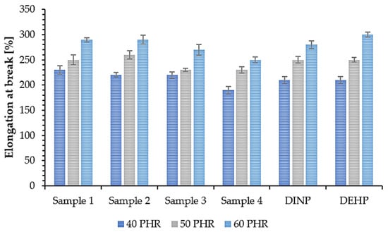 Plasticizer migration was determined according to the PN-EN ISO 177:2003 standard []. Polyethylene discs were used as an absorbing material, and the migration was defined after seven days. Three replicates were performed for each sample, and the average value was taken as the final result.