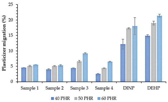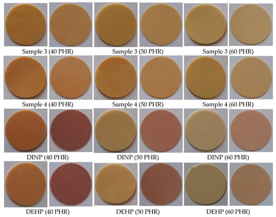 The appearance and color of the material are some of the most important factors affecting product quality and customer attraction. As shown in Figure 12, samples plasticized with commercial plasticizers (DINP and DEHP) definitely changed their color after the migration test. Samples were yellow before the test and maroon after. For samples prepared with synthesized plasticizers, their color almost did not change at all. The color change of the material is related to the degradation of PVC. It is well known that PVC degrades by dehydrochlorination at elevated temperatures, resulting in conjugated double bonds in the polymer chains and a noticeable color change (from yellow to pink, orange, red, brown, and finally black) when the sequences of conjugated polyenes contain more than four to five double bonds [,,,,]. In our study, the degradation was a result of a high migration of DINP and DEHP plasticizers shown in Figure 11, which makes the material more susceptible to degradation [].