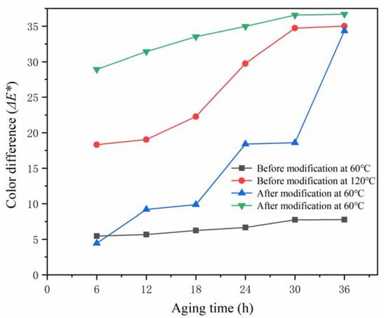 The changes in the color difference (ΔE*) [33] and gloss of the shellac before and after modification are shown in Figure 1 and Table 5. In the aging process, the color difference of the modified shellac and the modified shellac rosin mixture increased, and the color difference of the modified core material was large. At the incident angle of 60 °, the gloss of the modified shellac rosin mixture was 113.45%, which was higher than that of the modified shellac. In the first aging cycle, the gloss of shellac decreased rapidly before and after modification, and decreased slowly when the aging time was 12–30 h. With the extension of aging time, the gloss of the shellac before and after modification decreased, which was due to the volatilization of ethanol, the overflow of small gas molecules, and the generation of bubbles on the film surface. With the increase in time, the bubbles broke, the surface reflection changed from a mirror reflection to a diffuse reflection, and the gloss decreased.
