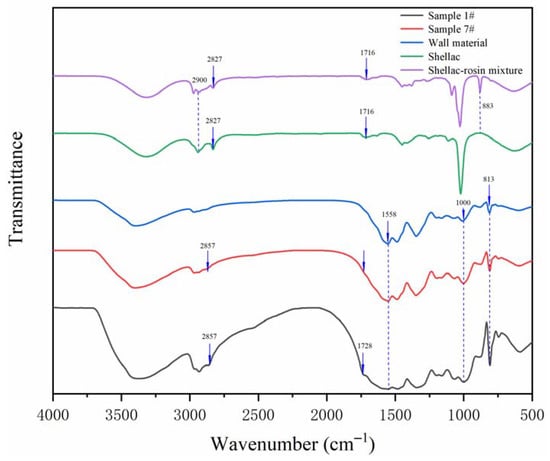 The FTIR of the wall material, core material, and microcapsule samples are shown in Figure 5. By observing the infrared curves of shellac and the shellac–rosin mixture, it can be found that the peak near 2900 cm−1 describes the stretching vibration of the –CH2 group, and the peak widens after mixing with rosin. Compared with the shellac curve, the peak at 883 cm−1 disappeared. Comparing the microcapsule sample curve and the wall material curve, the triazine ring bending vibration absorption peak appeared at 813 cm−1 in the wall material MF resin. The stretching vibration absorption peak of N–H was approximately 1558 cm−1, and the 1000 cm−1 was the absorption peak of C–O. These peaks can also be observed on the curves of microcapsule samples. At the same time, it can be observed in the curves of the core material and microcapsule samples that 2827 and 2857 cm−1 were the characteristic peaks of –CH3, and the wide peak at 1716 cm−1 was the stretching vibration of C=O [35], indicating that shellac and shellac–rosin composite as core material were successfully coated by MF resin, and the microcapsules were successfully prepared.