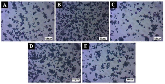 OM of the microcapsules under a single-factor test: (A) sample #10; (B) sample #11; (C) sample #12; (D) sample #13; (E) sample #14.