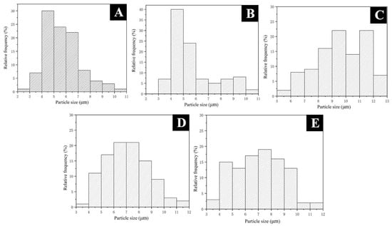 Particle size distribution of microcapsules: (A) sample #10; (B) sample #11; (C) sample #12; (D) sample #13; (E) sample #14.