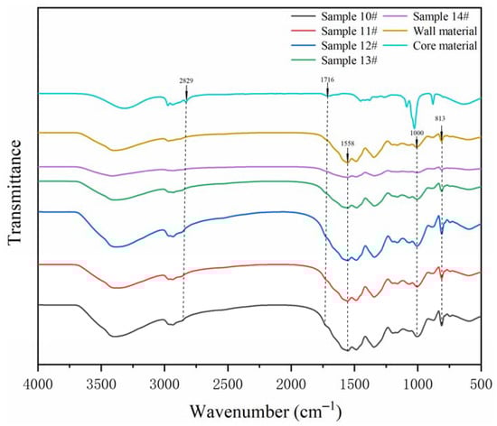 The FTIR of microcapsule samples prepared by single-factor test is shown in Figure 10. The curve trend of microcapsules prepared with five different HLB values was basically the same, indicating that the composition of these five microcapsules was the same. The triazine ring bending vibration absorption peak appears at 813 cm−1 in the wall material. The stretching vibration absorption peak of N–H was approximately 1558 cm−1. The 1000 cm−1 was the absorption peak of C–O, and the corresponding peak also appeared in the five microcapsule samples. At the same time, it can be observed in the curves of core material (shellac–rosin composite) and microcapsule that the 2827 and 2857 cm−1 were the characteristic peaks of –CH3. The wide peak at 1716 cm−1 was the stretching vibration of C=O, indicating that the microcapsule of shellac–rosin composite coated with MF resin was successfully prepared, and the chemical composition did not change.