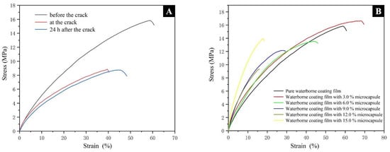 Stress–strain curves: (A) the pure waterborne coating before, at, and 24 h after the cracking; (B) waterborne coating containing microcapsules with different mass fractions.