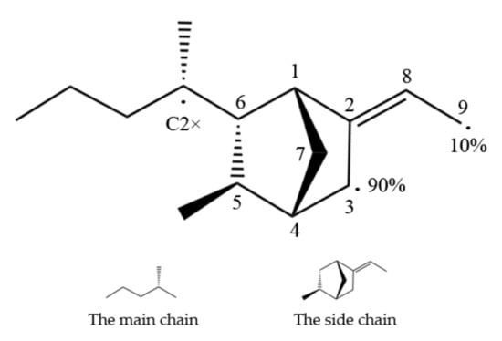 EPDM has a main chain and a side chain, as shown in Figure 1, and the main types of crosslinks formed are main–main chain cross-linking, main–side chain cross-linking, and side–side chain cross-linking. The target atoms for cross-linking are most likely the tertiary carbon(C2*) of the main chain and the C3 or C9 of the ENB monomer. The reaction rates of C3 and C9 were 90 % and 10%, respectively, according to earlier data [11].