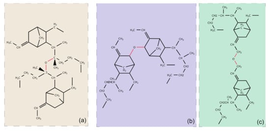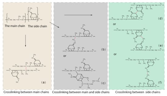 The products of thermal oxidation of EPDM are mainly ketones, carboxylic acids, hydroxyl alcohols, and ethers [2,25]. Of these, ethers are observed to be the main type of regenerative cross-link produced after thermal-oxidative ageing. These ethers may be grown in the main chain or in the side chain. The possible architectures are shown as Figure 3.