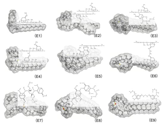 The strain magnitude of M6 and M4 in Figure 14b were almost equal to that of the M1, which suggests that the conformational entropy generated at the C9 atom of the side chain (i.e., C9-C9 cross-linking, and C2*-C9) was larger, compared to the cross-linking of the main chain (C2*-C2*).