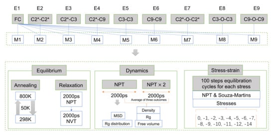 The MD simulation in this work were presented by the Forcite Package, and the whole process involved is shown in Figure 5. To produce a molecular conformation that more closely resembles the real EPDM material, the system needed to be optimally equilibrated, which was achieved by annealing and a series of kinetic equilibrium relaxations. The annealing was performed by heating the EPDM system sequentially from 298 K to 800 K with a temperature gradient of 50 K and cooled to 298 K with the same ramp. The 10 ps NPT dynamics were performed per ramp. The last frame of the annealed trajectory file was used as the initial structure for the kinetic equilibrium, and the system was successively subjected to NPT and NVT relaxation for 2000 ps under Berendsen thermostats. This was then followed by another 2000 ps NPT dynamics whose trajectory were used to compute the MSD and Rg distribution. The density evaluation, free volume and Rg were calculated here through averaging the results from three independent 2000 ps NPT simulations. The model closest to the mean values was used for the stress–strain calculations.