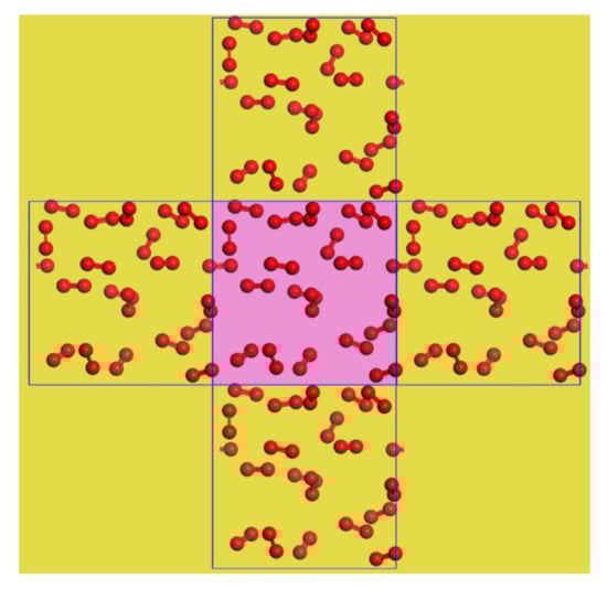The calculation of the forces and potentials between the molecules or atoms in a system requires traversing all the atoms, which is the most computationally intensive portion of a molecular simulation. For a typical non-crystalline simulation, the molecular motion is highly stochastic, and a large fraction of the atoms are on the boundary of the model, where the force and potential fields are very different from those inside the system. The development of periodic boundary conditions perfectly addresses this issue. With periodic boundary conditions, the simulated system is in a space that is fully surrounded by its translated copies, forming an infinitely large lattice. As shown in Figure 6, when an atom moves to the initial box boundary, all boxes copy its path of motion. Thus, when an atom crosses one boundary of a box, it will appear with a same motion from the opposing side. To avoid duplication in the calculation of forces and potentials between the atoms in the mirror and atoms in the simulated system, the nearest mirror law is introduced, under which a particle in the simulated system only calculates the potential energy of the interaction between the particle closest to it.