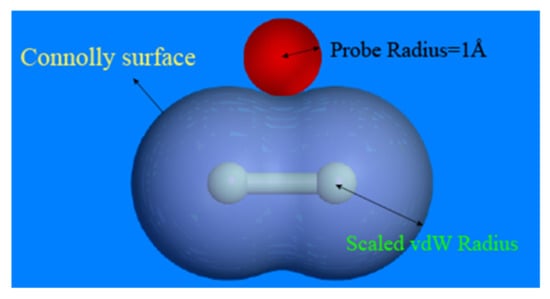 The probe scan can be used to determine the EPDM model’s free volume. A Connolly surface defines the border between the probe and the atoms, as shown in Figure 7, with the free volume on the outside of the atomic surface and the occupied volume on the inside [28]. In this paper, the model’s free volume was estimated by generating a Connolly surface and splitting the periodic bounding box into multiple grids with 0.15 Å spacing. The free volume can be calculated by scanning these grids with a probe of radius 1 Å. If over half of the grid is occupied by the probe, it will be marked as “free”, and if more than one half of the grid is filled with atoms, it will be marked as “occupied”. When two unoccupied grids are adjacent, they are recognized as a free volume and the proportion of the free volume to the total volume is defined as the fractional free volume (FFV) [29].