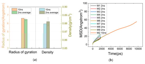 As can be seen in Figure 8a, both the deviation of Rg and density between the 10 ns and 2 ns results was within the error range of 2 ns calculations, and 8b shows that the slopes of the MSD curves obtained from the 10 ns and 2 ns simulations were in good agreement. Thus, it is roughly considered that the system was properly relaxed.