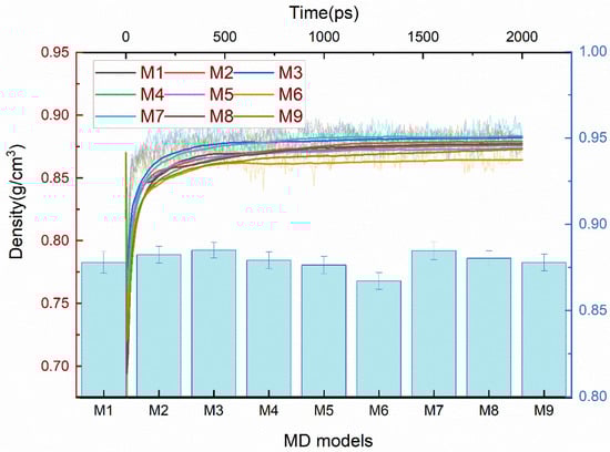 As shown in Figure 9, the M3 with C2*-C3 cross-links and M7 with C2*-O-C2* cross-links were denser than the others, and the M2 with C2*-C2* cross-linking, M4 with C2*-C9, and M8 with C3-O-C3 cross-linking were denser than the M1 without cross-links, M5 with C3-C3, and M9 with C9-O-C9 cross-linking. The M6 with C9-C9 cross-links were less dense than the above models. Of these reactants and products, the lowest density occurred at the cross-linking bonding of C9-C9, and it can be verified from the results that the M9 was less dense than the M7 and M8, and that the M6 was less dense than the M2 and M5. This might be related to the configuration of the cross-linked structure and the volume created, which will be explained in the subsequent analysis.