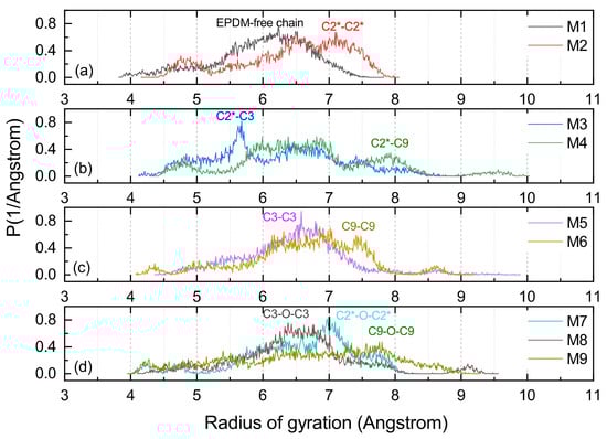 Rg is suitable for a proper assessment of the volume shaped by the molecular chain, and the distribution function of the Rg could serve to evaluate the conformational flexibility of long chains [30,31]. As shown in Figure 10, all the MD models with cross-links had a larger Rg than the M1, and this is because cross-linking commonly causes a large radical radius. The structure shaped by C9-O-C9 had the largest Rg of any of the cross-linking types. Furthermore, it could be found that the Rg of M6 (C9-C9) and M4 (C2*-C9) were at a high level, which can be verified from Figure 11b–d, and the cross-linking types with C9 consisted of C2*-C9, C9-O-C9 and C9-C9 with a radius of gyration distribution between 7.5 and 9 Å. The large span and flattened peaks of the Rg distribution curves for the M4 and M6 imply that their molecular segments were more flexible.