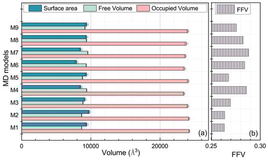 The volumetric parameters of the MD models. (a) describes the occupied volume, the free volume and the area of the Connolly surface of varied cross-linked EPDM models, and (b) illustrates the FFV of these MD models.
